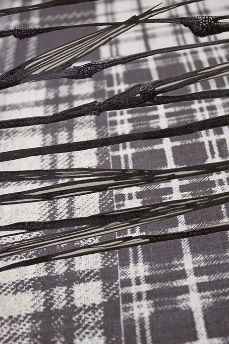 In much the same vein I've been revisiting favourite Moorland plant drawings and capturing the essence of them in loose inky plant drawings. Here I've overlaid them onto a monochrome version of the tartan backgrounds from the cushion prints - it's just the starting point for a new scarf collection (but which I expect to be in full moorland colour!).